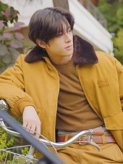 Di sesi pemotretan bersama member ENHYPEN lainnya untuk Spur Magazine, Jake tampil memesona dengan outfit serba oranye mengenakan jaket dari brand MIU MIU