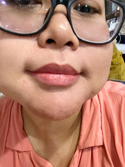 Selain itu, area bibir yang gelap di bagian ujung bibir juga tampak sedikit mulai memudar meskipun belum terlalu optimal dan garis-garis bibir juga terlihat sedikit tersamarkan saat menggunakan produk ini.